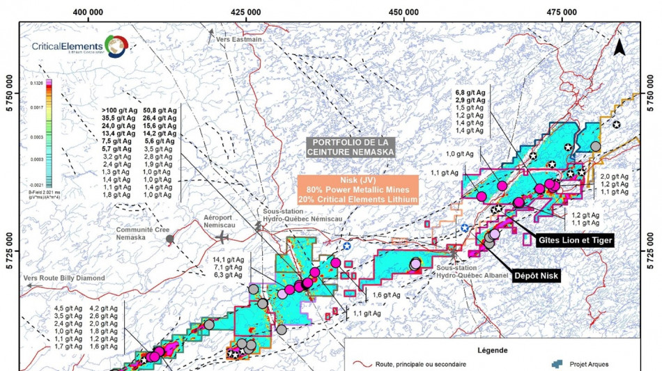 L'intérêt pour la minéralisation à haute teneur en nickel-cuivre-EGP dans la région s'est accru grâce au succès des travaux d'exploration menés par Power Metallic Mines Inc. (« Power Metallic »), anciennement Chilean Metals Inc. Critical Elements a optionné la propriété Nisk à Power Metallic en 2020 (voir le communiqué de presse daté du 23 décembre 2020). Suite à l'exercice de l'entente d'options par Power Metallic sur la propriété abritant le gisement de Ni-Cu-EGP Nisk et la nouvelle découverte polymétallique Lion, Critical Elements conserve une participation non dilutive de 20 % jusqu'à ce qu'une étude de faisabilité définitive concernant les activités d'extraction et de production soit complétée sur la propriété Nisk. Critical Elements détenait également un peu plus de 10 millions d'actions de Power Metallic au 31 mai 2025 (états financiers intermédiaires résumés pour la période de neuf mois close le 31 mai 2025).