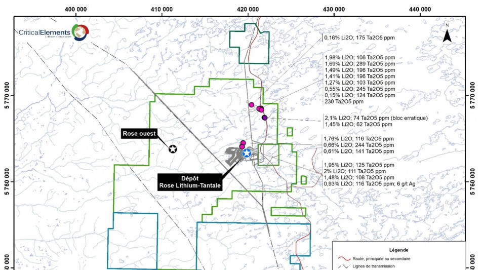 Critical Elements aspire à devenir un fournisseur responsable de lithium aux industries florissantes des véhicules électriques et des systèmes de stockage d'énergie. À cette fin, Critical Elements fait progresser le projet de lithium de haute pureté Rose lithium-tantale situé au Québec et détenu en propriété exclusive par la Société. Rose est le premier projet de lithium de la Société à être avancé dans un portefeuille de terrains de plus de 1 016 km2. Le 29 août 2023, la Société a annoncé les résultats d'une nouvelle étude de faisabilité sur Rose pour la production de concentré de spodumène. Le taux de rendement interne après impôts du Projet est estimé à 65,7 %, avec une valeur actualisée nette après impôts estimée 2,2 milliards $ US à un taux d'actualisation de 8 %. Du point de vue de la Société, le Québec est stratégiquement bien positionné pour les marchés des États-Unis et de l'UE et dispose d'excellentes infrastructures, notamment un réseau électrique à faible coût et à faible émission de carbone contenant 94 % d'hydroélectricité. Le Projet a reçu l'approbation du ministre fédéral de l'Environnement et du Changement climatique sur la recommandation du Comité d'évaluation conjoint, composé de représentants de l'Agence d'évaluation d'impact du Canada et du gouvernement de la Nation Crie, a reçu le certificat d'autorisation du ministère de l'Environnement, de la Lutte contre les changements climatiques, de la Faune et des Parcs du Québec et le bail minier du projet délivré par le ministre des Ressources naturelles et des Forêts du Québec en vertu de la Loi sur les mines (Québec).