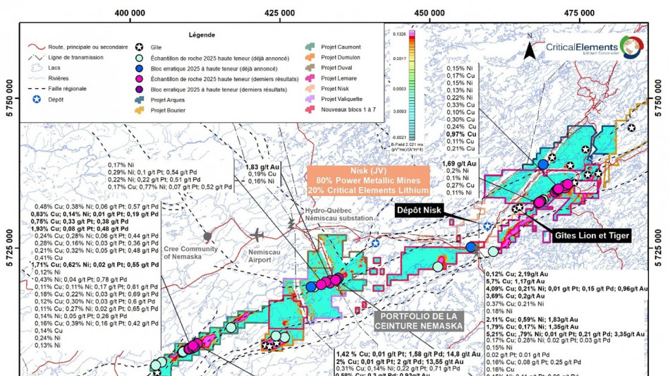 MONTREAL, QC / ACCESS Newswire / 4 novembre 2025 / Corporation Lithium Éléments Critiques (TSXV:CRE)(OTCQX:CRECF)(FSE:F12) (« Critical Elements » ou la « Société ») a le plaisir d'annoncer les derniers résultats du programme d'exploration estival 2025 réalisé sur le groupe de propriétés de la ceinture de Nemaska, détenu à 100 % par Critical Elements, dans la région d'Eeyou Istchee au Québec (Figure 1).
