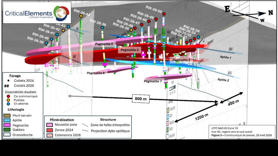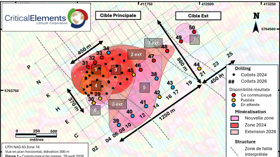 MONTRÉAL, QC / ACCESS Newswire / 29 avril 2026 / Critical Elements Lithium Corporation (TSXV:CRE)(US OTCQX:CRECF)(FSE:F12) (« Critical Elements » ou la « Corporation ») a le plaisir de communiquer les résultats d'analyse obtenus à ce jour et de faire le point sur la phase 1 de son programme de forage de l'hiver 2026, effectué sur le site de la découverte Rose Ouest (« Rose Ouest »), détenue à 100 % par la Société, situé à Eeyou Istchee, au Québec.