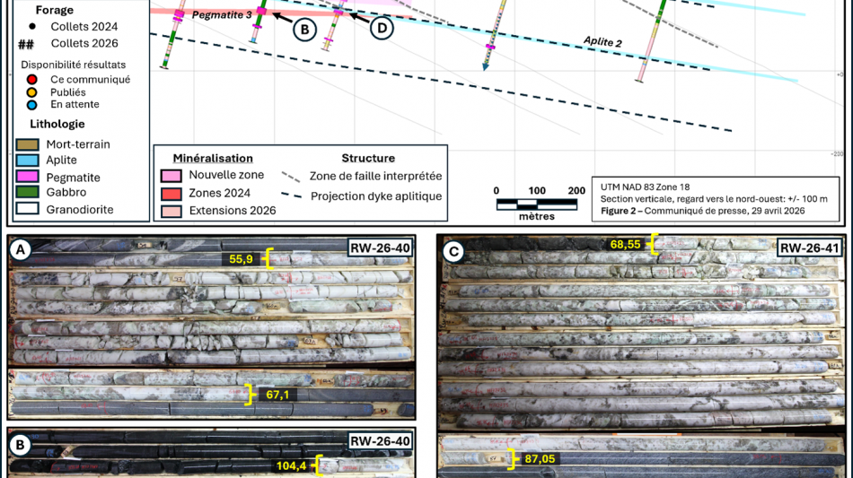 Couvrant une superficie de 500 m x 600 m, les forages au sud (RW-26-38 à RW-26-44) ont également recoupé deux pegmatites importantes, interprétées comme étant la pegmatite 5 (nouvelle) et la pegmatite 3 ; elles présentent une épaisseur toujours comprise entre 10 et 15 mètres. Les résultats d'analyse de ces trous ne sont pas encore disponibles, mais devraient refléter la concentration de spodumène observée dans la carotte.