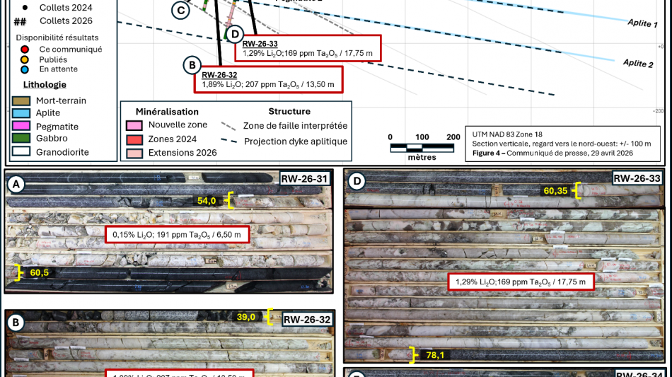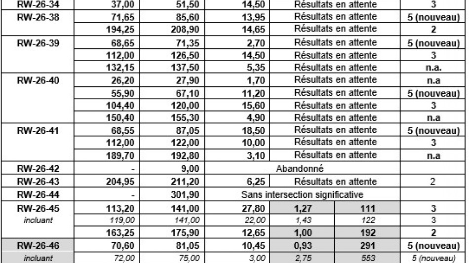 Les résultats d'analyse ont été reçus pour les trous RW-26-31 à 33 et RW-26-46 à 50, et ont donné des teneurs en lithium et en tantale, comme indiqué ci-dessous :