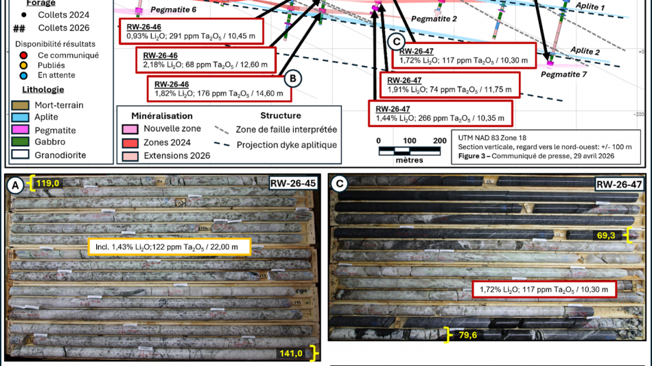 1,91 % Li2O et 74 ppm Ta2O5 sur 11,75 m, Pegmatite 3, dans le forage RW-26-47