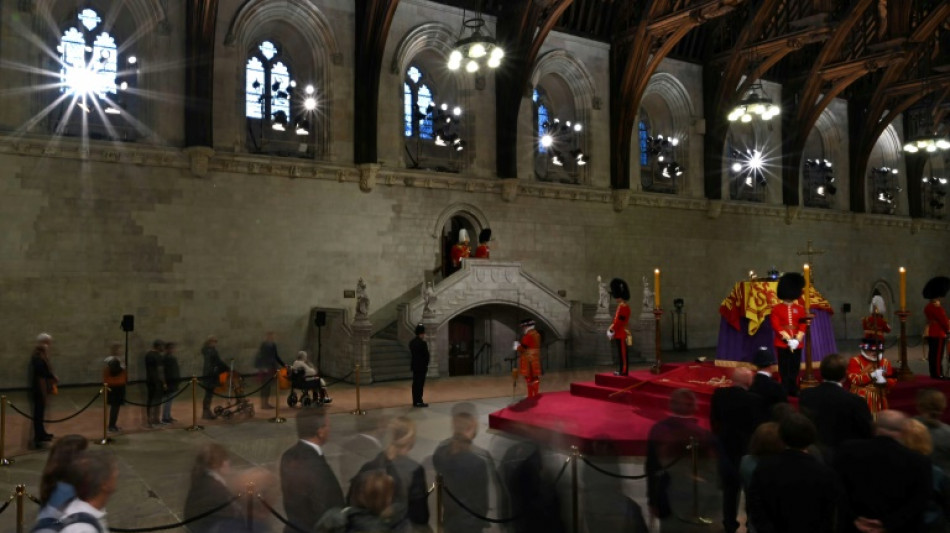 Arrivée d'Ecosse où la souveraine s'est éteinte, la dépouille est présentée sur un imposant catafalque à Westminster Hall, la plus vieille salle du Parlement britannique ouverte 24 heures sur 24 jusqu'à lundi 06H30, jour des ultimes adieux avec des funérailles nationales à l'abbaye de Westminster, en présence de centaines de dignitaires étrangers et de têtes couronnées.