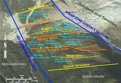 Deep Trench-Ader: 15,3 m mit einem Gehalt von 37,1 g/t Au, 8,3 m mit einem Gehalt von 58,6 g/t Au, 11,6 m mit einem Gehalt von 28,3 g/t Au