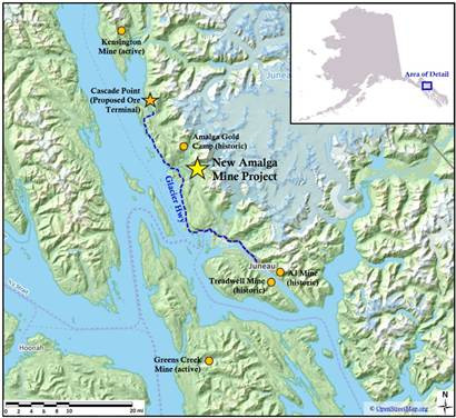 Eine 100-prozentige Beteiligung am Goldprojekt New Amalga, das sich in der Nähe der Infrastruktur nur 25 km nördlich von Juneau (Alaska) und 6 km von einer ganzjährig befahrbaren asphaltierten Straße entfernt befindet (Abb. 2)