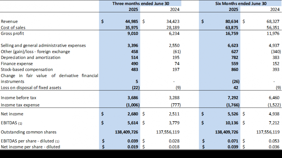 EBITDAS per share (diluted) (1) of $0.039 increased by $0.011 (39.3%) compared to $0.028 in Q2/2024. EBITDAS of $5,614 increased by $1,835 (48.6%) compared to $3,779 in Q2/2024. This increase was principally due to increased revenue, increased gross profit and the contribution from CustomVac (May 15 to June 30).