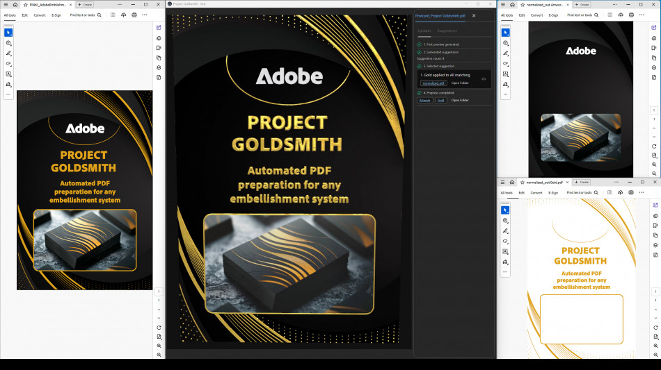 Designs with embellishments often require complex coordination between designers and print service providers, with workflows varying widely across equipment and teams. The new Project Goldsmith by Adobe aims to simplify the process of adding special finishes like foiling and varnishing to printed materials by automating job preparation and creating accurate, ready-for-production files. It bridges the gap between designers and print service providers (PSPs), ensuring high-margin embellishment jobs are produced with speed and precision by reducing errors and manual workarounds.