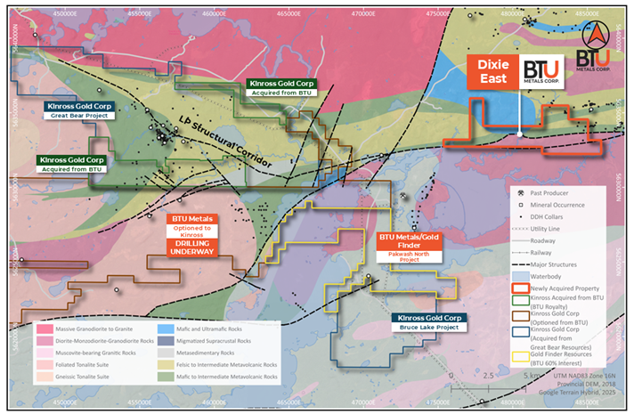 Spanning nearly 10 kilometres of east-trending structural trends now recognized to host the world class Dixie gold deposit, the Dixie East property remains virtually unexplored for LP Fault-style gold mineralization. Remarkably, the area has seen no drilling activity in over 30 years-and previous efforts were limited to base metals exploration at the eastern edge of the property. Geological indicators including felsic tuffs, sericite schists, quartz feldspar porphyry units, shearing, quartz veining, and sulphide mineralization with reported zinc and copper values mirror those found in the mineralized zones at the Great Bear deposit. According to Kinross's latest public presentation, the LP Fault-the principal host of mineralization at GBR-extends beyond the current eastern boundary and the Company is convinced these deep-seated regional structures continue through to the Dixie East claims. BTU also holds royalties on nearby properties located just 4.5 km west of Dixie East. With initial exploration activities being planned, the Company will provide ongoing updates as it advances the development of a comprehensive geological model for this highly prospective and underexplored gold project.