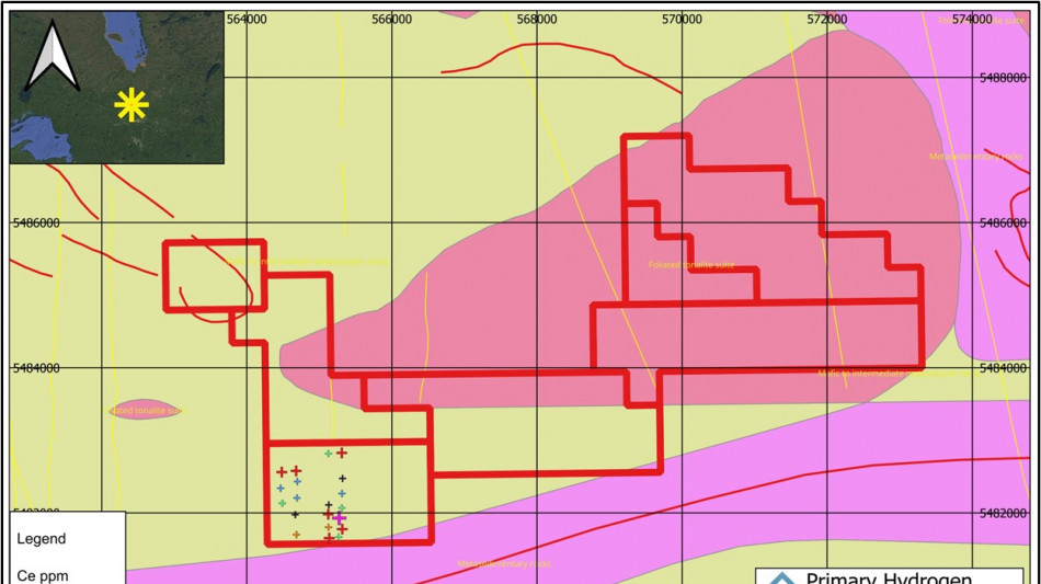 The Hopkins property is situated within the Kapuskasing Structural Zone of the Superior Province. The local geology comprises Precambrian metasedimentary paragneiss and migmatites, muscovite-bearing granitic rocks, and alkalic intrusives. Target features include northeast-trending faults, the Clay-Howels Alkali Complex formation, and multiple forest rings-circular vegetation anomalies that may indicate subsurface hydrogen seepage.