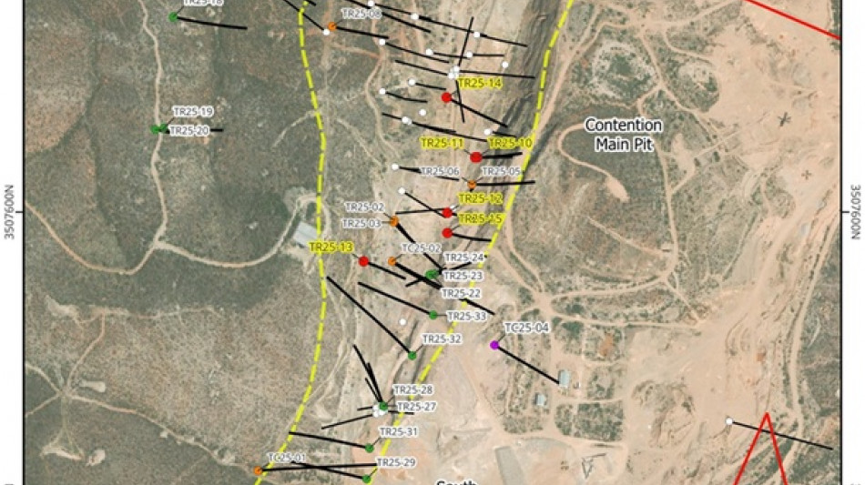 Hole TR25-9 - Was collared from the western side of the Contention Target easterly across and to depth 273.6 m the main Contention area. It was designed to test continuity of the mineralization on the western side and below other, prior RC drillholes. It intersected three zones of Ag-Au mineralization with it bottoming in 164.2 m of 16.74 gpt AgEq (0.014 gpt Au, 7.31 gpt Ag).Over 76% of the drillhole's length was composed of mineralized intersections. The drillhole leaves the mineralization open to the west and to depth. Drilling was stopped due to hole stability. The interval is composed of siliciously and argillically altered, lower Bisbee group fine-grained sandstones/quartzites, siltstones/hornfels and limestones cut by hydrothermal breccias, quartz-feldspar porphyry dikes, and faults/fissures with quartz veining. Moderate to strong iron oxides, manganese oxides, orange to red color, and oxidized pyrite sites.