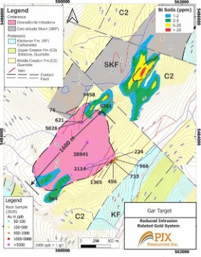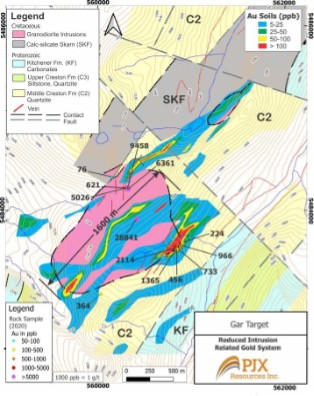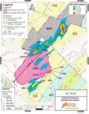 Historical soil sampling has defined a 1600 m long gold in soil anomaly over the Gar intrusion (Figure 3). The soil gold anomaly extends beyond the Gar intrusion contact, covering a sparsely exposed area of hornfelsed sedimentary rocks that likely cap the top of the intrusion. Therefore, the Gar intrusion may be larger in size than is shown on the map as it may connect at depth, under the sedimentary cap, with the small intrusion mapped to the north. Veining and mineralization are present in the hornfelsed and skarned sedimentary rocks around the intrusions. Historical soil sampling also outlines areas with anomalous bismuth and molybdenum (Figures 3 and 4).
