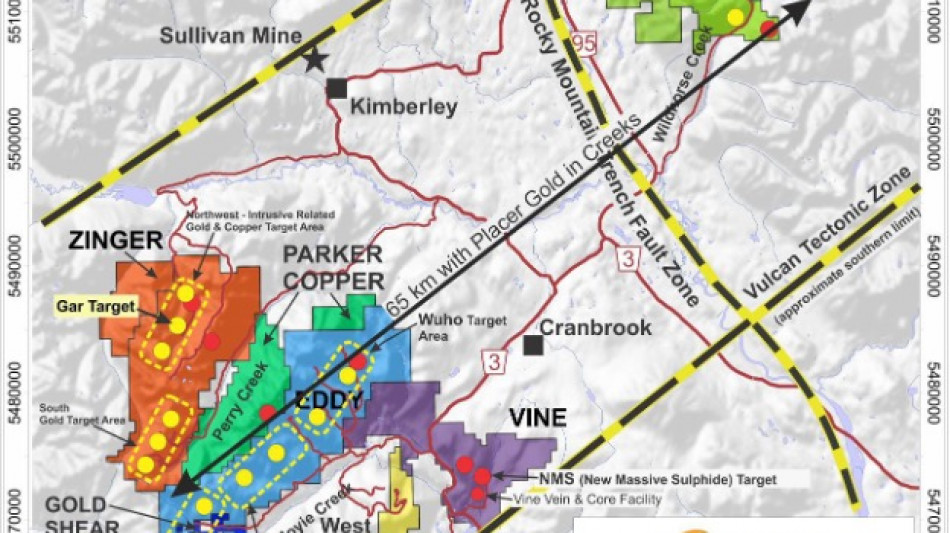 Figure 1 - PJX Properties (color coded) in the Sullivan Mining District that includes the Vulcan Gold Belt defined by 65 km of creeks with placer gold. PJX has identified more than 10 highly prospective gold target areas (yellow dots). Gar is a Reduced Intrusion Related Gold System (RIRGS) type target on the Zinger Property. PJX also has more than 10 silver, zinc, lead, copper, and/or critical metals targets (red dots). Estella Basin, Lewis Ridge, and Grundy Creek are priority Sullivan deposit type targets on the Dewdney Trail Property.