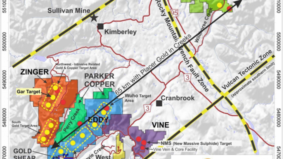 Figure 5- PJX Properties (color coded) in the Sullivan Mining District that includes the Vulcan Gold Belt (Vulcan Tectonic Zone) defined by 65 km of creeks with placer gold. PJX has identified more than 10 highly prospective gold target areas (yellow dots). Gar is a Reduced Intrusion Related Gold System (RIRGS) type target on the Zinger Property. PJX also has more than 10 silver, zinc, lead, copper, and/or critical metals targets (red dots). Estella Basin, Lewis Ridge, and Grundy Creek are priority Sullivan deposit type targets on the Dewdney Trail Property.