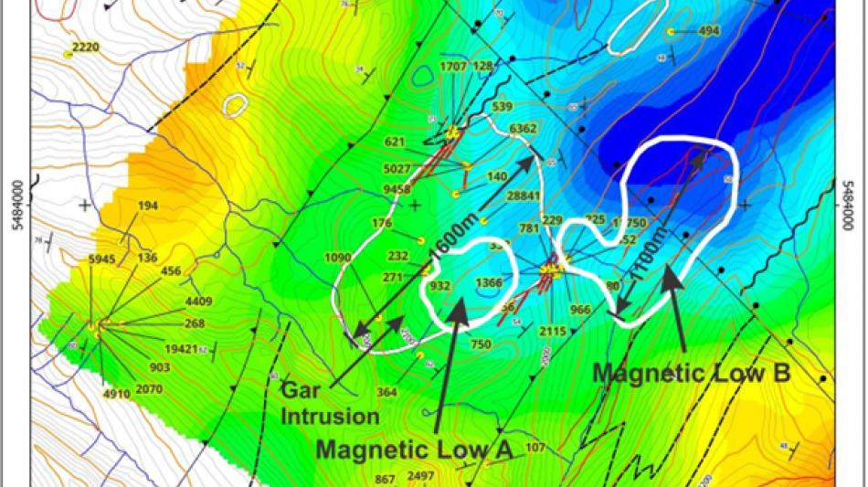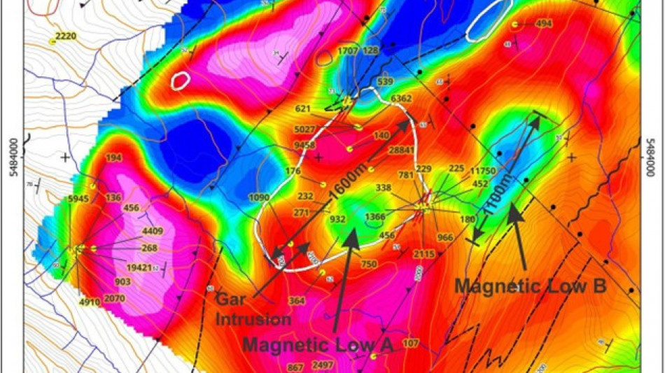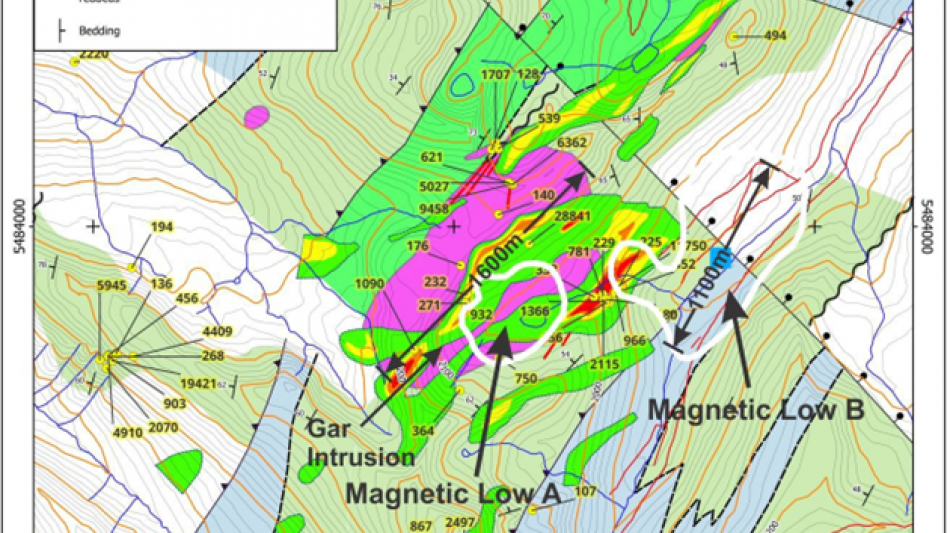 Figure 4 - Large (1600 m) historical gold in soil anomaly is coincident with the Gar intrusion and magnetic low A. Part of magnetic low B is coincident with the strongest part of the soil geochem anomaly as well as sheeted veins with gold in outcrop. Both magnetic lows occur in swamp or overburden covered areas near or at the valley bottom.