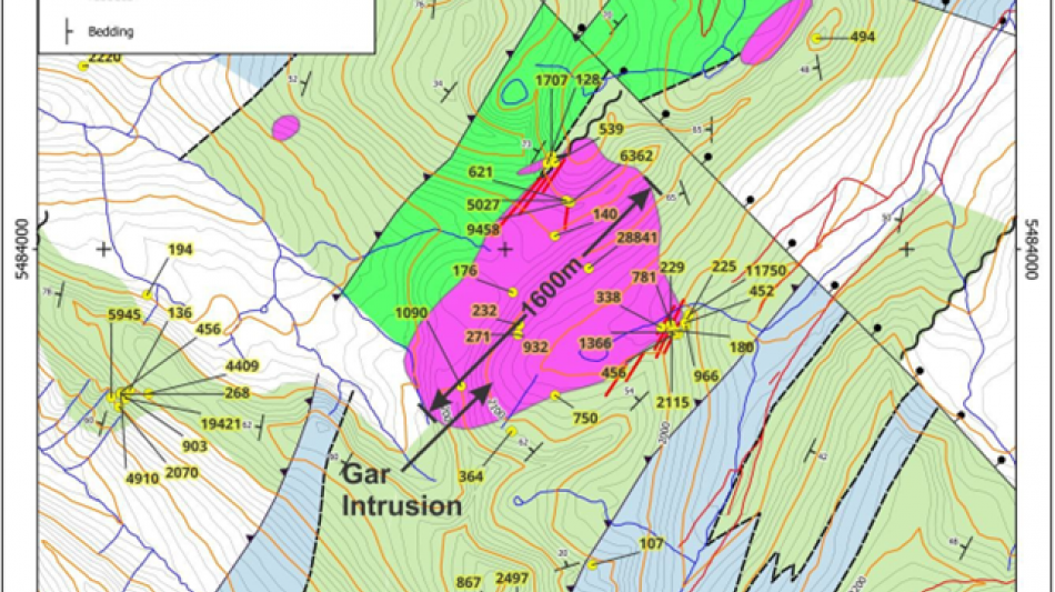 Figure 1 - Gold in rock grab samples of sheeted quartz veins within the Gar intrusion and in hornfels to skarn altered sedimentary rocks above and around the intrusion.