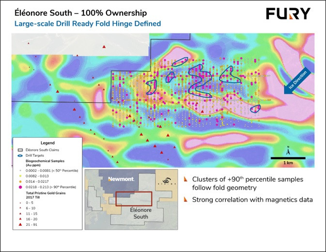 "We have identified six robust drill-ready targets through the combination of geology, geophysics, recent geochemistry as well as combing through historical geochemical survey data. Pairing our targeting matrix with our team's past experience working at the Éléonore Mine has given us a high confidence level as we have moved this target from conceptual through the pipeline to being drill ready," commented Bryan Atkinson, P.Geol., SVP Exploration of Fury.