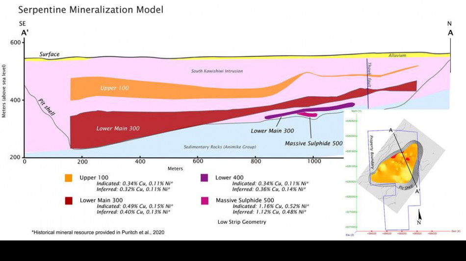 Figure 2: Simplified schematic cross-section (A-A') representing the intrusion that hosts mineralization as well as the footwall sedimentary rocks that host some of the relatively higher grade sulphide veins. The inset map shows the model of the resource in map view as well as the historical pit shell location relative to the project boundary, all labeled.