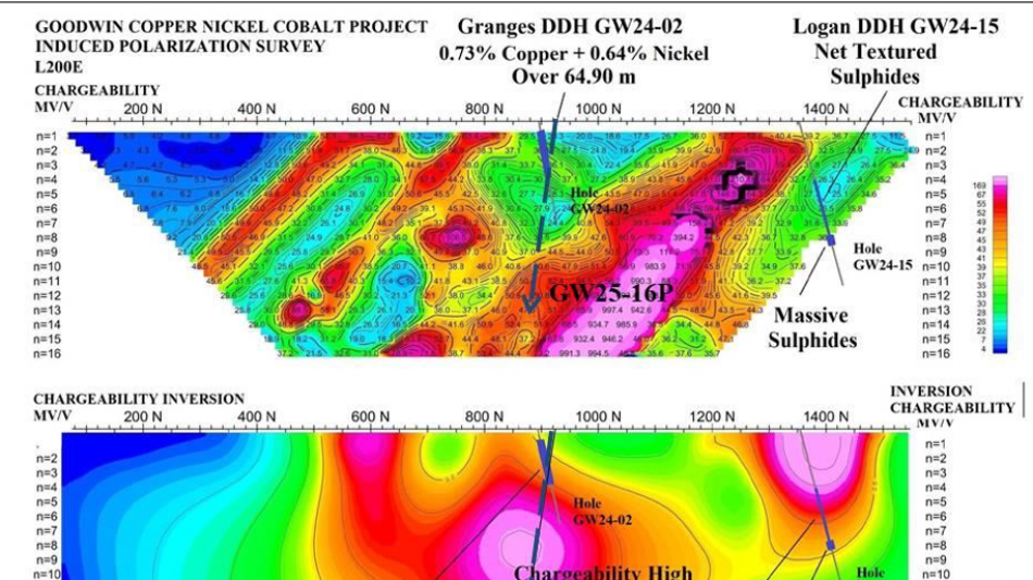 Figure 1. Projection of DDH GW25-16 and GW24-02 with Chargeability and Inversion L200E