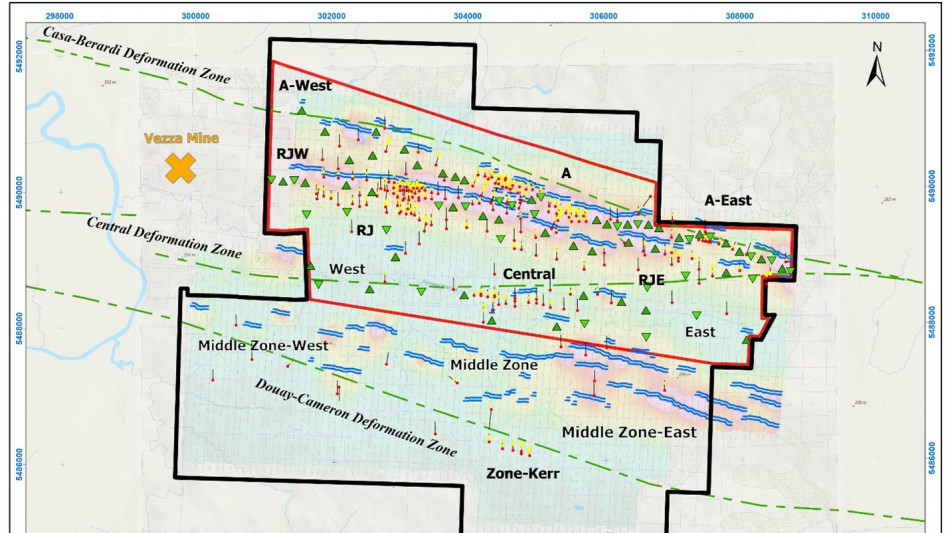 Phase 1 will target the "A" zone, a shallow, highly continuous, low-variability historic gold deposit with ~522,900 ounces of which only ~35% of strike has been drilled (>3.1 km open), and the "RJ" zone, host to high-grade intercepts from historical drill holes as high as 51 g/t Au over 0.8 metres2, which was expanded by Agnico Eagle Mines in 2008 in the most recent drilling at the Property.