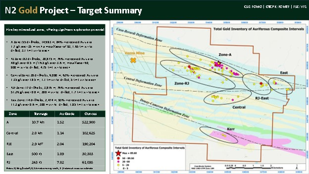 Formation Metals Inc. is a North American mineral acquisition and exploration company focused on the development of quality properties that are drill-ready with high-upside and expansion potential. Formation's flagship asset is the N2 Gold Project, an advanced gold project with a global historic resource of ~870,000 ounces (18 Mt grading 1.5 g/t Au (~809,000 oz Au) across four zones (A, East, RJ-East, and Central)2,3 and 243 Kt grading 7.82 g/t Au (~61,000 oz Au) across the RJ zone2,4) and six mineralized zones, each open for expansion along strike and at depth including the "A" zone, of which only ~35% of strike has been drilled (>3.1 km open), and the "RJ" zone, host to historical high-grade intercepts as high as 51 g/t Au over 0.8 metres.