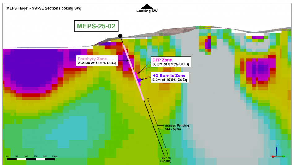 "By integrating surface geology, resistivity data, and insights from our Phase 1 drilling, we refined our targeting model and were able to adjust in real time. MEPS-25-02 immediately delivered bornite from near surface and went on to produce the highest copper and gold grades drilled to date. This validates our geological approach and confirms the GFP Porphyry as a key driver of mineralization at Soo Copper."
