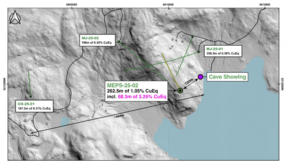 The MEPS target was selected for its surface mineralization at the Cave Showing where Sterling Metals sampled veins with up to 15.9% Cu in 2024 (see press release dated October 29, 2024), its coincidence with a large resistivity low, and its proximity to the GFP Porphyry discovered in Phase 1 (hole MJ-25-01). The first hole drilled at MEPS provided critical geological context, refining the interpretation of the mineralized trend and guiding adjustments to subsequent drill angles.