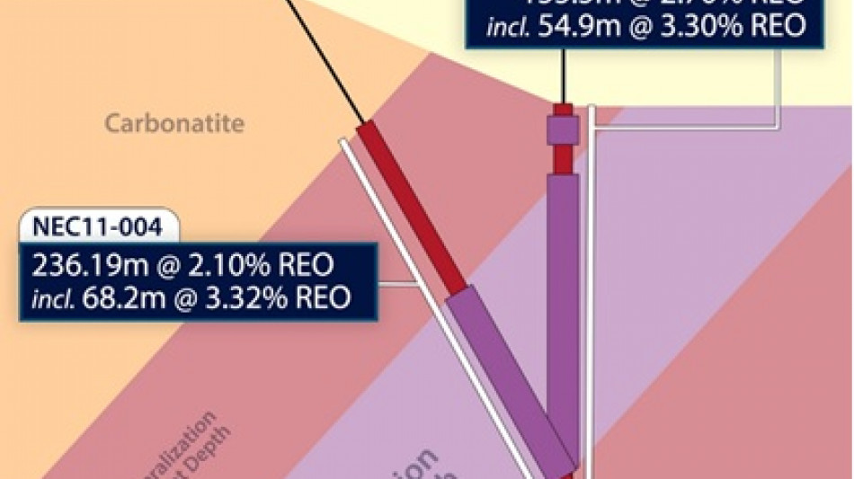 "The drill hole (NEC11-004) encountered REE mineralization within strongly altered carbonatite and associated alkaline rocks. The step-out from historical hole EC-93 confirms the potential for a sizable deposit. As well, the potential for the discovery of a high-grade core is also highlighted with 10 individual assays greater than 4.0 per cent TREO (average sample width of 1.37 metres) within the 68.18-metre high-grade REE zone."