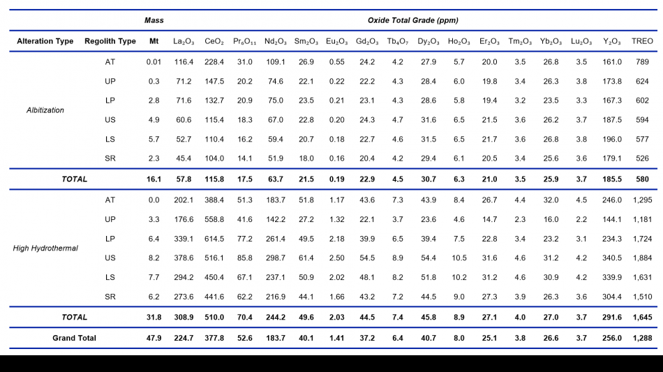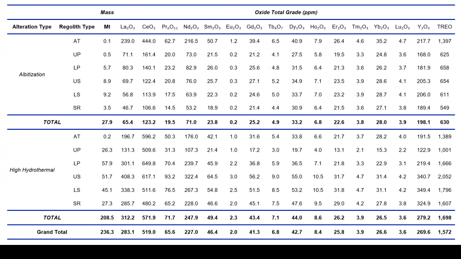 Table 1 summarizes the MRE, including TREO, NdPr, Dy, and Tb contents by geological domain. Further details of the MRE are provided in Tables 7 and 8.