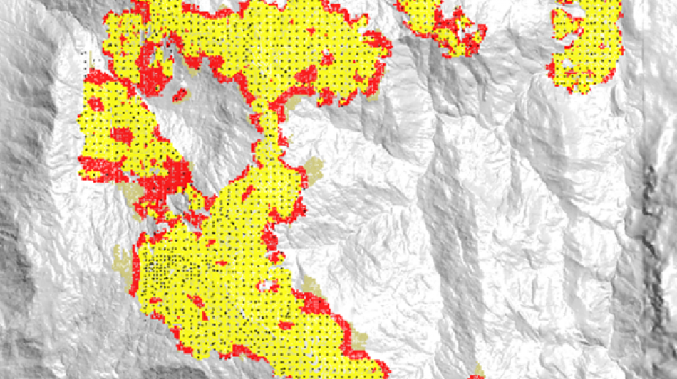 Figure 4: Plan view of resource classification map; yellow: indicated mineral resource blocks; red: inferred mineral resource blocks; light brown: blocks that remain unclassified due to insufficient drill support; black dots: drillhole composites used in the estimation. (Source: Aclara, 2025)