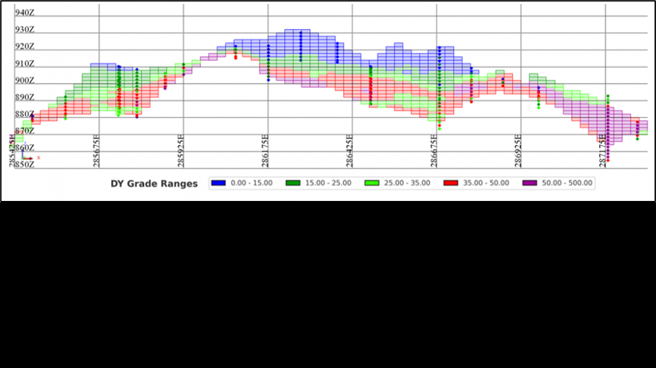 Figure 3: Estimated block model grade distribution for dysprosium along section NS = 8495000; Z-axis has been vertically exaggerated by a factor of five to enhance visualization of the stratigraphy and grade distribution. (Source: ABelco, 2025)