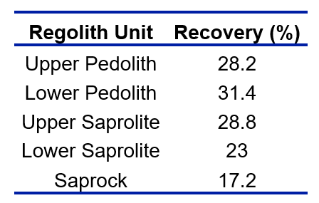 Recoveries were calculated as the median of the ratio desorbable to total grade for each REE within each regolith unit and shown in Table 6. Metallurgical recovery results were obtained from analyses performed by AGS Laboratory in La Serena, Chile, and SGS Geosol Laboratory in Vespasiano Minas Gerais, Brazil from a total of 14,001 drilling samples.