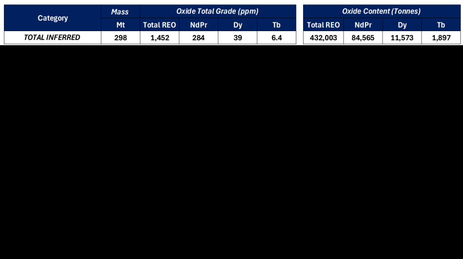Consistent grades of magnetic rare earths: Indicated mineral resources report stable and consistent magnetic element grades, including dysprosium oxide (Dy₂O₃) at 42.7 ppm, terbium oxide (Tb₄O₇) at 6.8 ppm, and NdPr oxide (Nd₂O₃ & Pr₆O₁₁) at 292.6 ppm, closely aligned with the 2024 Resource Statement (Dy₂O₃: 42.1 ppm, Tb₄O₇: 6.9 ppm, NdPr: 296.5 ppm).