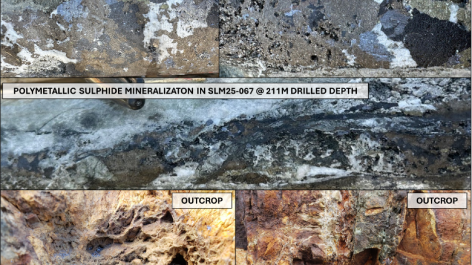SLM25-067, the first drill hole completed of the 2025 season, successfully intersected repetitive zones of argentiferous galena and sphalerite-bearing sulphide mineralization for over 150m along this trend and confirmed continuity of mineralization intersected in 2022 to 182m true depth (211m drilled depth).