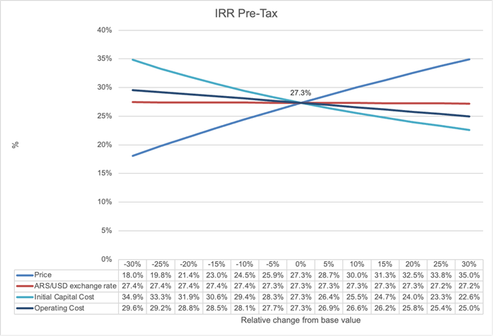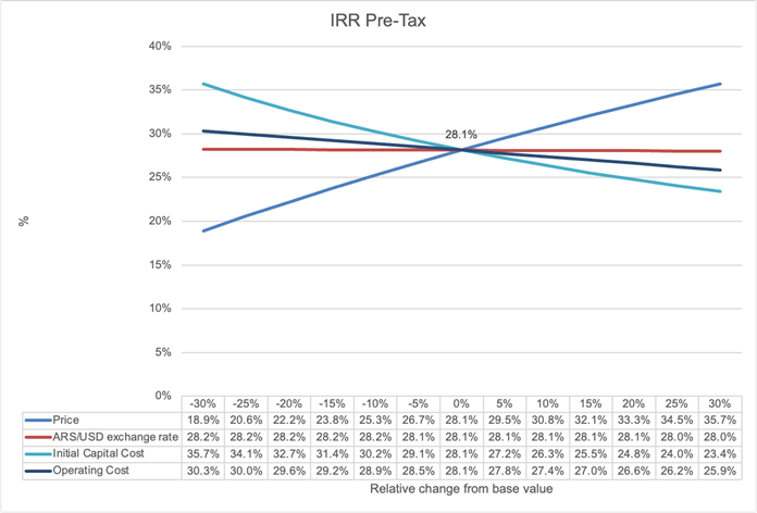 Pre-tax internal rate of return (IRR) of 28.1% for 40,000 tpa production. Post-tax IRR of 23.3%.
