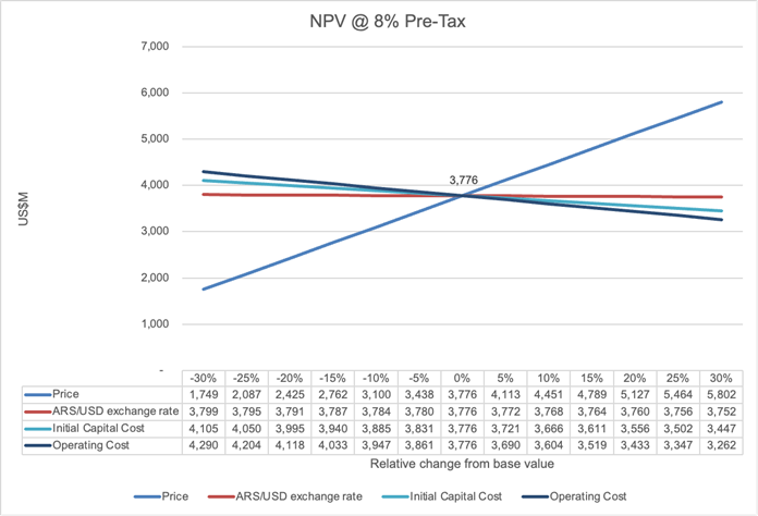 Pre-tax net present value (NPV) at an 8% discount of $2.065 billion for a single 20,000 tpa operation. Post-tax NPV at an 8% discount of $1.276 billion for a single 20,000 tpa operation.