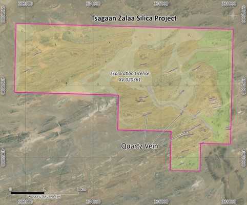 The Tsagaan Zalaa project is located in Saikhandulaan soum, Dornogovi Province, in southeastern Mongolia (Figure 1). It is connected with a road to Sainshand, capital of the Dornogovi Province in the Eastern Gobi steppe, approximately 95 km to the east, located along the Trans-Mongolian Highway and Railway connecting Mongolia's capital city of Ulaanbaatar with China. Sainshand is 200 kilometres from the Chinese border and serves as the local depot for silica and other mineral exports to China. Tsagaan Zalaa (Figure 2) is also situated only 18 km from the local community of Saikhandulaan soum(Figure 3) and covers an area of 1,670.28 hectares. The Project is strategically positioned to serve the growing regional demand for high-purity quartz silica ("HPQ"). Massive high-purity quartz veins up to 5 metres in width (Figures 4 and 5) hosted by Upper-Middle Devonian sediments are exposed on surface across the Project. In February 2025, the Company announced the submission of the Mining License application, with today's achievement marking the decisive regulatory confirmation needed to advance the Project toward the final operating approval.