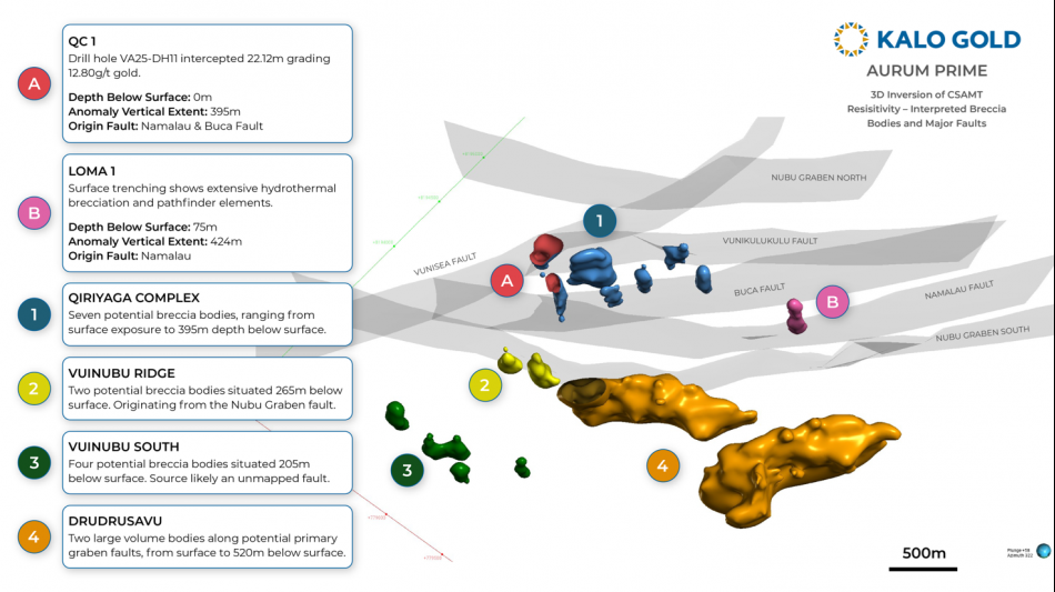 Figure 1. Aurum Epithermal Field - Geophysical Resistivity Model (3D-CSAMT) and Structural Interpretation. Three-dimensional model showing sixteen high-resistivity anomalies interpreted as breccia bodies within the Qiriyaga Complex (1) and surrounding structural corridors (2-4 and B). Seven potential breccia bodies are delineated at Qiriyaga Complex, extending from surface to 395 m depth, including QC1 (A) where VA25-DH11 intersected 22.12 m @ 12.80 g/t Au. Additional targets are defined at Vuinubu Ridge (2), Vuinubu South (3), and Drudrusavu (4), extending to depths of 200-520 m along the Nubu Graben, Vunisea, Loma (B) and Buca fault intersections. These zones are interpreted as diatreme or hydrothermal breccia conduits representing key fluid pathways within a vertically extensive epithermal system.