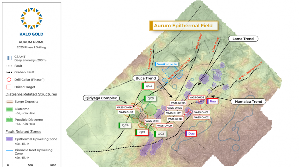 VANCOUVER, BC / ACCESS Newswire / October 15, 2025 / KALO GOLD CORP. (TSXV:KALO) ("Kalo" or the "Company") reports results from the 2025 Phase 1 drilling program, comprising eleven diamond drill holes totaling 2,436.7 metres completed across the Qiriyaga Complex and Namalau Trend within the Aurum Epithermal Field. The program has intersected bonanza-grade gold mineralization in VA25-DH11 at target QC1, Qiriyaga Complex on Kalo's 100%-owned Vatu Aurum Project in Fiji, confirming the presence of a high-temperature epithermal system and validating the Company's diatreme model (see news release dated October 1, 2025).