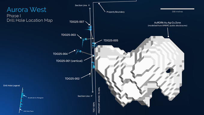 Further downdip and to the north, at a vertical depth of 440 metres below surface, Phase I drill hole TDG25-007 extended the Aurora West Zone with multiple intersections: 0.84 g/t Au, 1.1 g/t Ag, 0.33% Cu over 64.0 m, 0.48 g/t Au, 0.8 g/t Ag, 0.18% Cu over 27.0 m, 0.87 g/t Au, 1.5 g/t Ag, 0.23% Cu over 19.0 m and 0.59 g/t Au, 1.8 g/t Ag, 0.25% Cu over 19.0 metres.