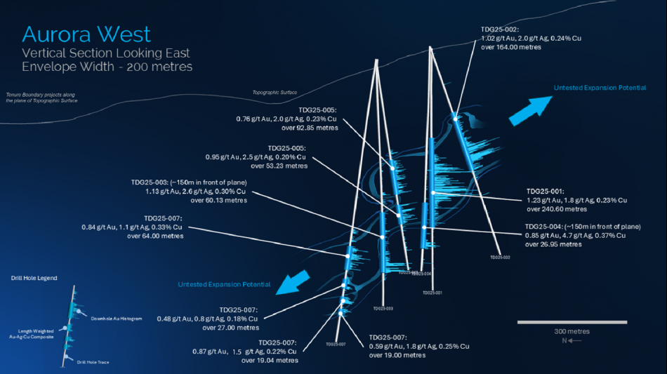 Building upon the results from TDG25-001, recently completed 2025 Phase I drill hole TDG-25-002 intersected 1.02 g/t Au, 2.0 g/t Ag, 0.24% Cu over 164.0 m, including a higher-grade sub-interval averaging 1.73 g/t Au, 2.6 g/t Ag, 0.32% Cu over 67.0 m, demonstrating that the Aurora West mineralization extends up dip and south of TDG25-001. This new extension begins at a vertical depth of 175 metres below surface and remains open to further expansion (Figure 1 & 2).