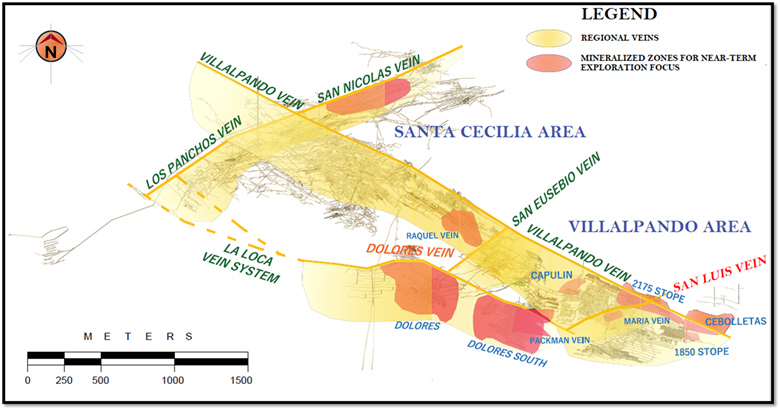 The Dolores Vein runs NNW, parallel to the Villalpando vein; together these two mineralized systems are the most prolific vein systems in the eastern half of the Guanajuato mining district. Drilling into the Dolores Vein via a single drillhole (DOL25-01) confirmed both the continuity of the mineralized system at depth and evidence of a lateral extension; DOL25-01 returned 0.60 g/t gold and 163 g/t silver over 0.69 metres. The Company will now focus on servicing and developing this area in advance of exploitation.