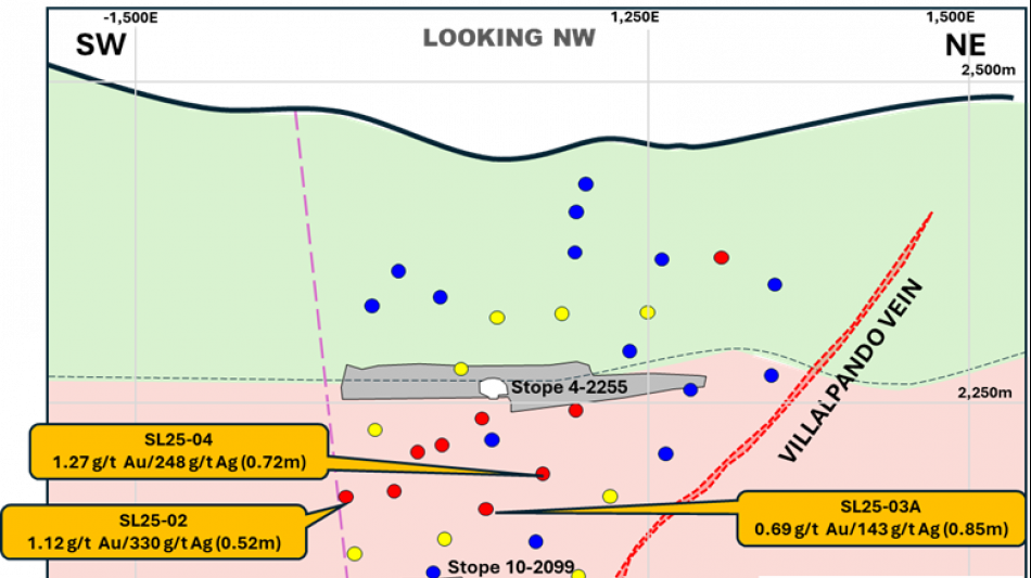 Another new vein discovery near the San Luis Vein also returned grades of over two kilograms per tonne silver-equivalent (SL25-10: 13.02 g/t gold and 970 g/t silver for 2077 g/t AgEq* over 0.18 metres).