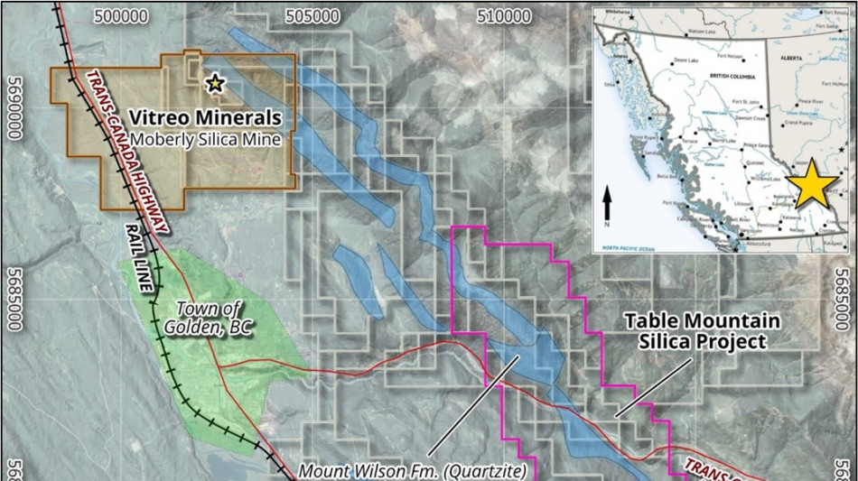 The Table Mountain Silica Project is located approximately 4 kilometres east of Golden, B.C., Canada, with excellent year-round road access and proximity to the Canadian Pacific Railway's Golden rail yard. The property covers roughly 2,526 hectares, encompassing up to 11 kilometres of regionally mapped strike length of the Mount Wilson Formation quartzite, with widths ranging from 300 to 1,400 metres at surface. Table Mountain is strategically situated near two established high-purity silica operations - the Moberly Silica Mine and the Sinova Quartz Quarry - both of which demonstrate silica purity greater than 99.6% SiO₂.(1)(2)* This advantageous location highlights the project's potential to become a significant source of high-purity silica in a region known for hosting premium-quality silica deposits.