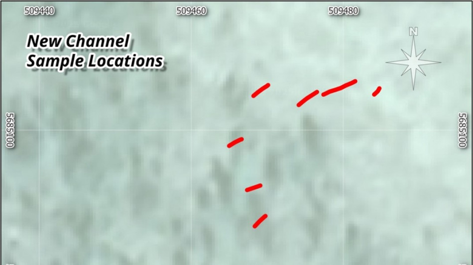A total of 47 samples were collected, primarily along two main channel lines at 1-metre intervals (truncated at outcrop edges) covering an area of approximately 2,500 square metres. Channels were oriented perpendicular to bedding to approximate true widths of the silica zones. Sampling locations were positioned to complement the 2024 and 2025 UAV LiDAR surveys and to guide upcoming resource definition and drilling planned for the 2026 field season. Figure 2 below illustrates the sample locations within the mapped quartzite unit.