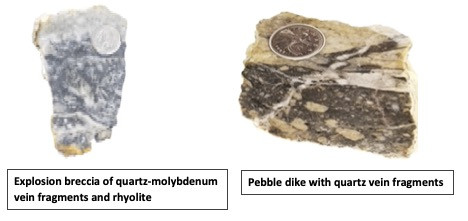 Molybdenum-rhenium mineralization, although not common across the entire property, occurs at surface in several locations within a porphyry intrusive complex. Significant areas of intense clay-pyrite alteration are centered over a rhyolite, latite and monzonite porphyry complex. High-grade values of rhenium are associated with molybdenite mineralization comprising of quartz-molydenite stockwork veins.