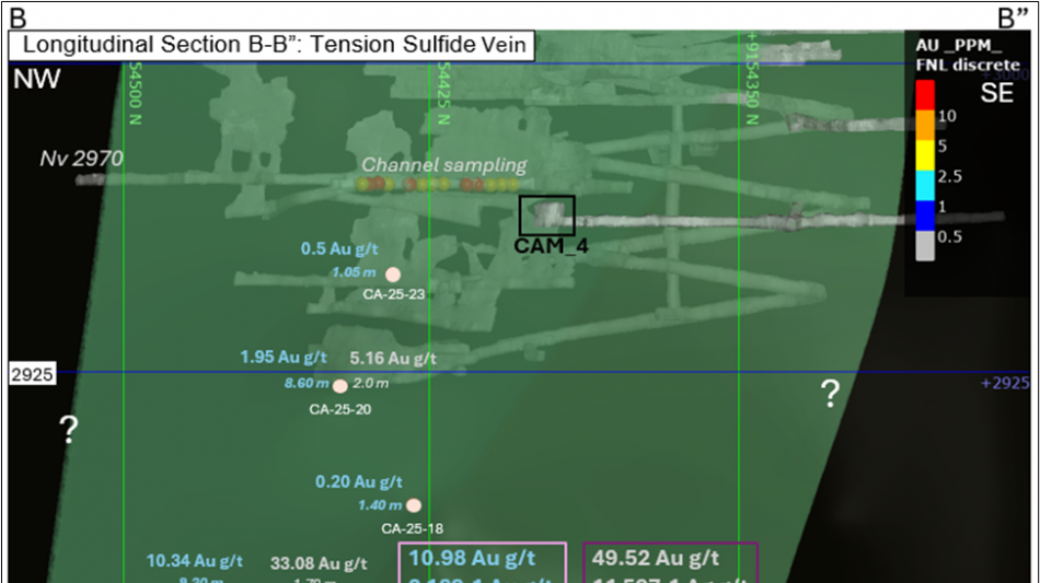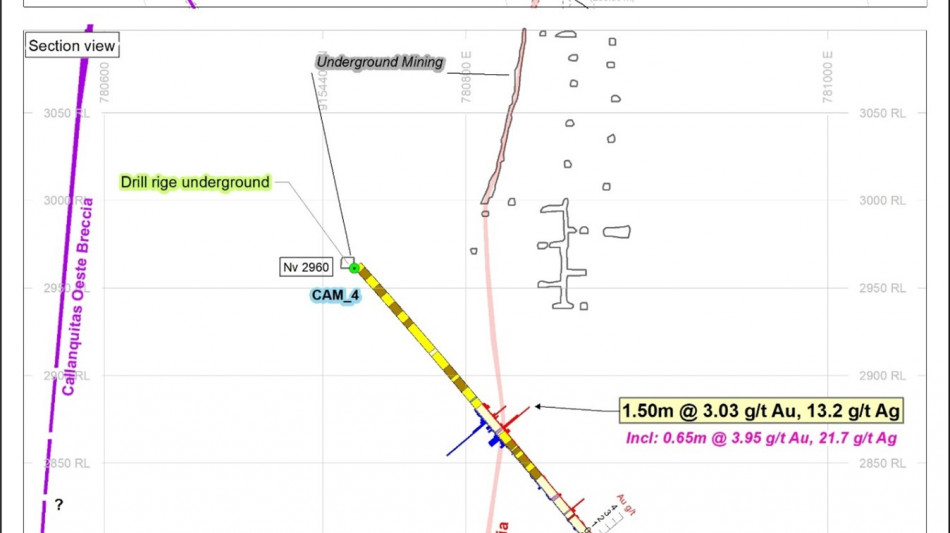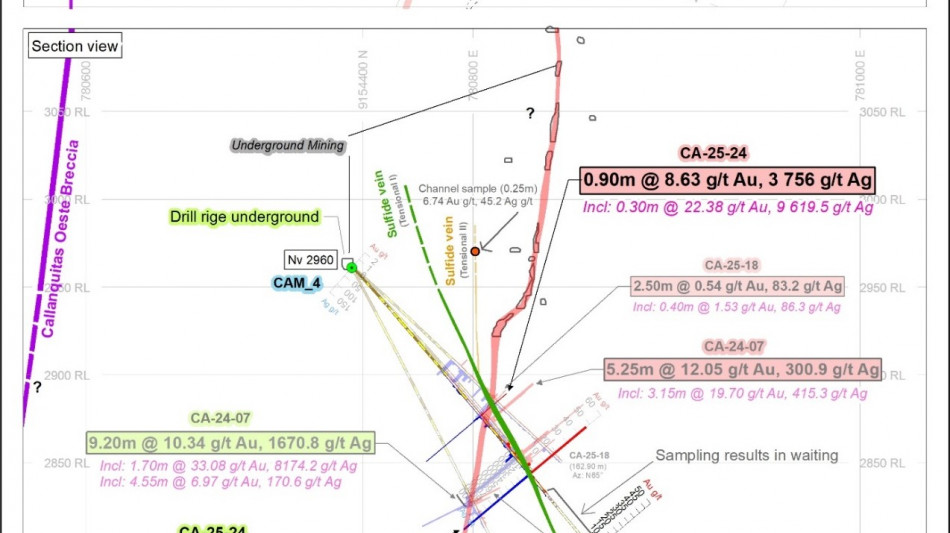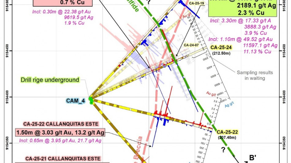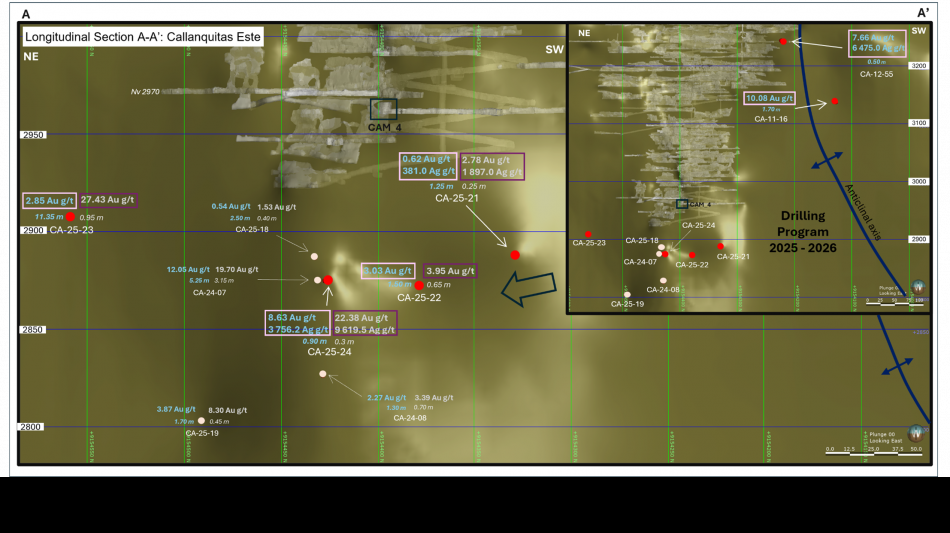 The drillhole CA-25-24 intercepted the Callanquitas Este structure and Tension Vein sulfide zone, located 6 meters south of CA-24-07 (DDH historic 07), a twinned hole. The drillhole CA-25-23 intercepted the Callanquitas Este structure and Tension Vein sulfide, located 150 meters north of 07. The drillhole CA-25-22 intercepted the Callanquitas Este structure, located 55 meters south of 07. The drillhole CA-25-21 intercepted the Callanquitas Este structure, located 103 meters south of 07. All boreholes are drilled from chamber 04, located at an elevation of 2960 meters above sea level. (See Figure 1 and 2-5, Section: drill holes and Longitudinal section).