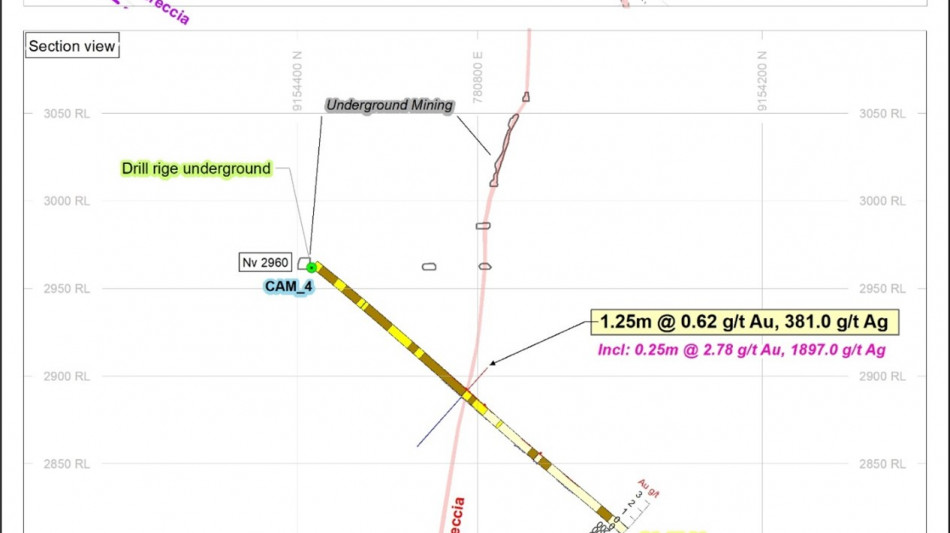 The drill hole CA-25-21 intercepted a mineralized section grading 0.62 g/t Au, 381.0 g/t Ag and 0.3% Cu over 1.25 meters and includes a grade of 2.78 g/t Au, 1897.0 g/t Ag and 1.3% Cu over 0.25 meters at Callanquitas Este (sulfide zone).