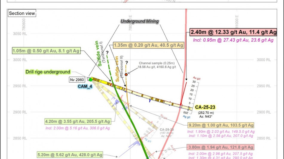 The drillhole CA-25-23 intercepted the Callanquitas Este structure and Tension Vein sulfide zone, located 150 meters north of 07 and 35 meter above. The best being the section grading 12.33 g/t Au and 11.4 g/t Ag over 2.4 meters, Callanquitas Este (oxide mineralized zone, goethite - limonite). It also intercepted sections of low-grade tension veins (mixed zone).