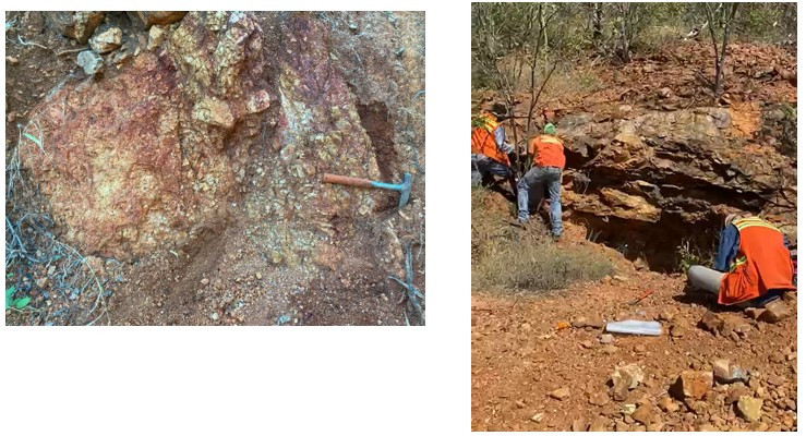 Plate 1. Photos across the North Alteration Zone. Left, mineralized structure recently mapped and sampled. Right, large underground shaft tied to a broader network of workings found in the center of the North Alteration Zone.